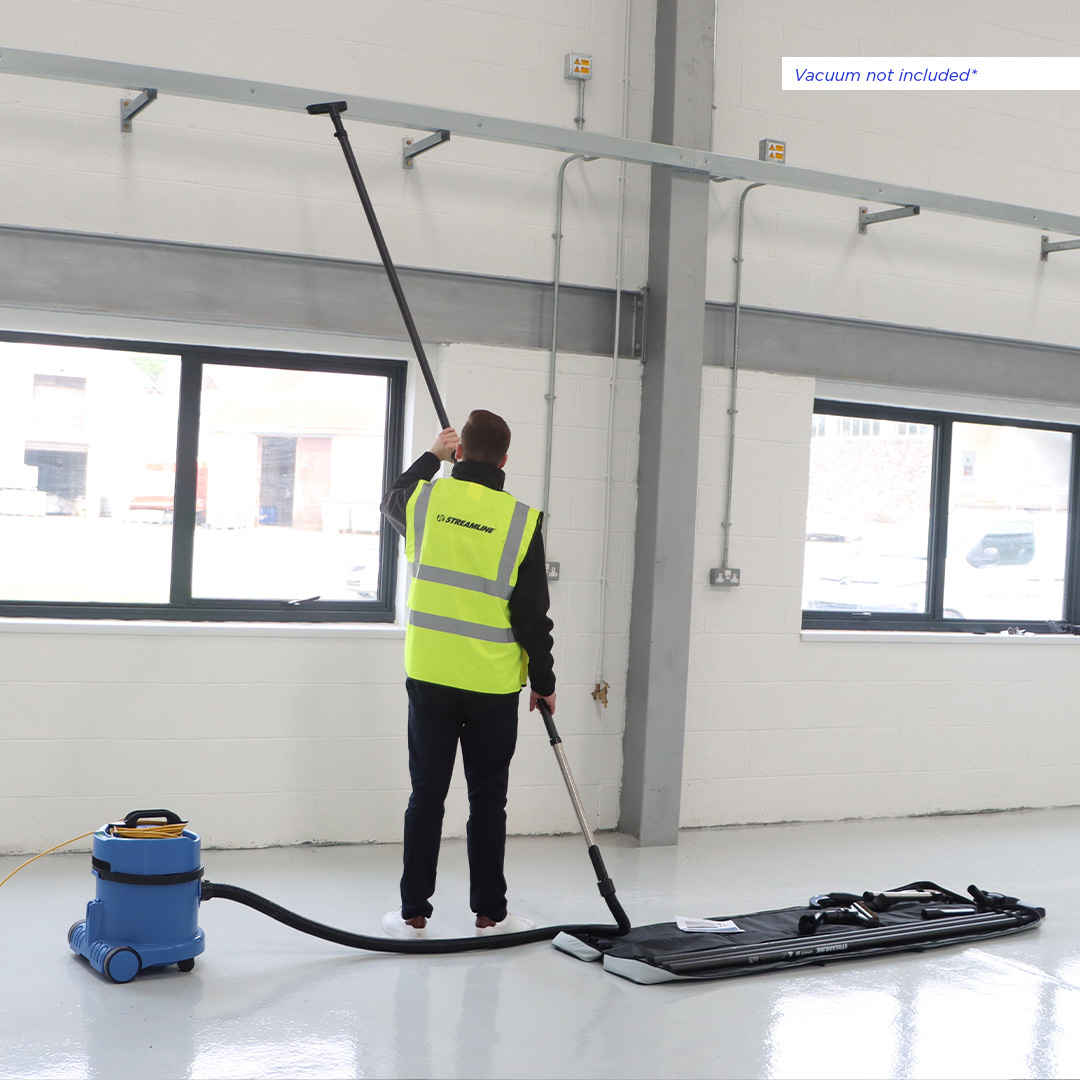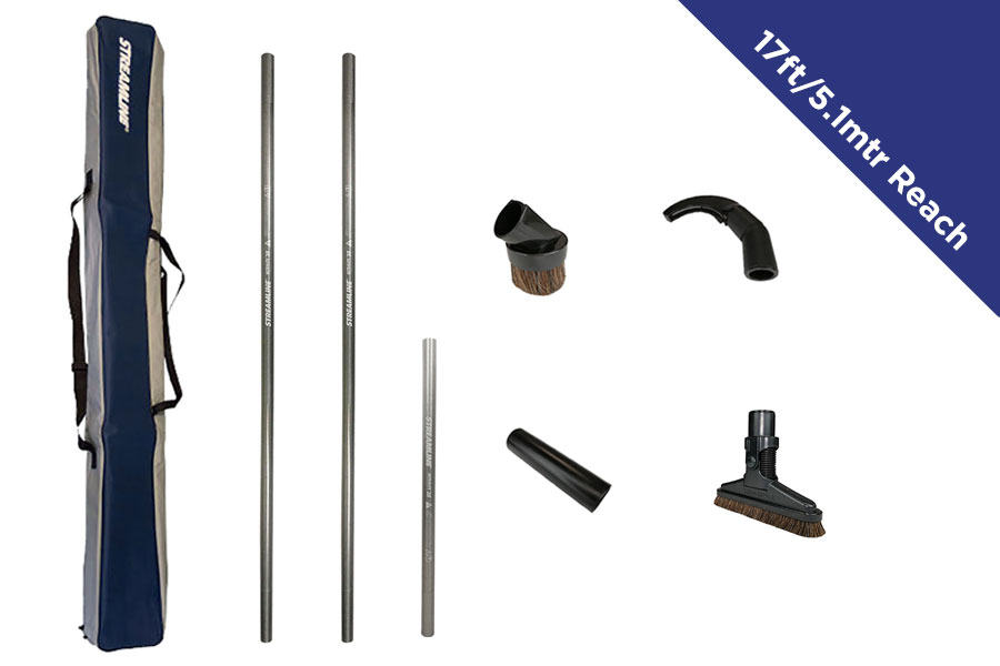 17ft/5.1mtr siekio vidinis dulkių siurbimo rinkinys, skirtas prijungti prie jūsų dulkių siurblio, komplektuojamas su 2x 6ft 38mm arba 32mm 100% stiklo pluošto strypais ir 1x 3ft 38mm arba 32mm stiklo pluošto strypu. Rinkinys leidžia prisijungti prie bet kurio standartinio buitinio dulkių siurblio ir siurbti dulkes aukštyje!