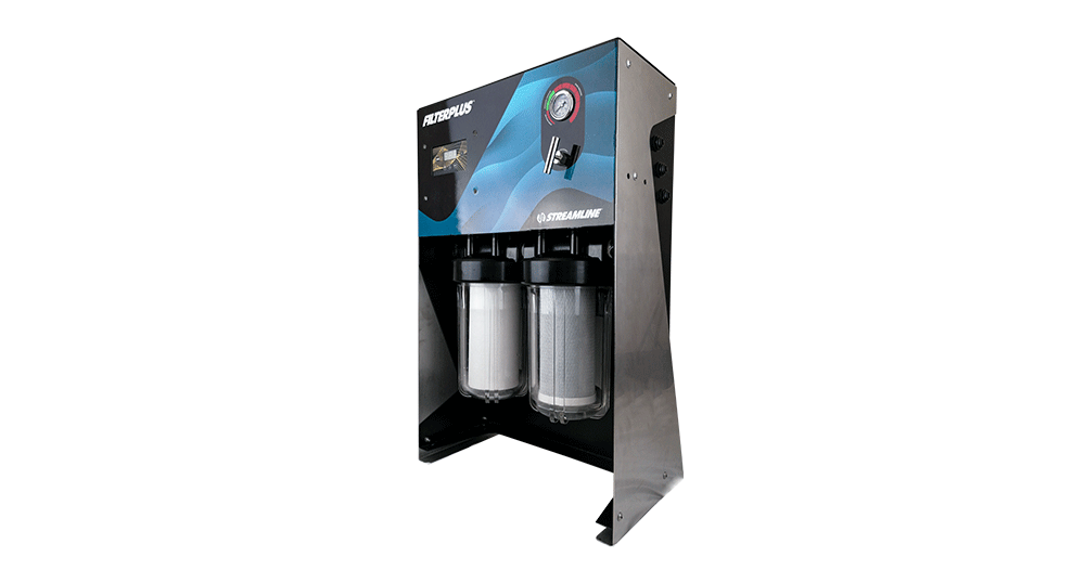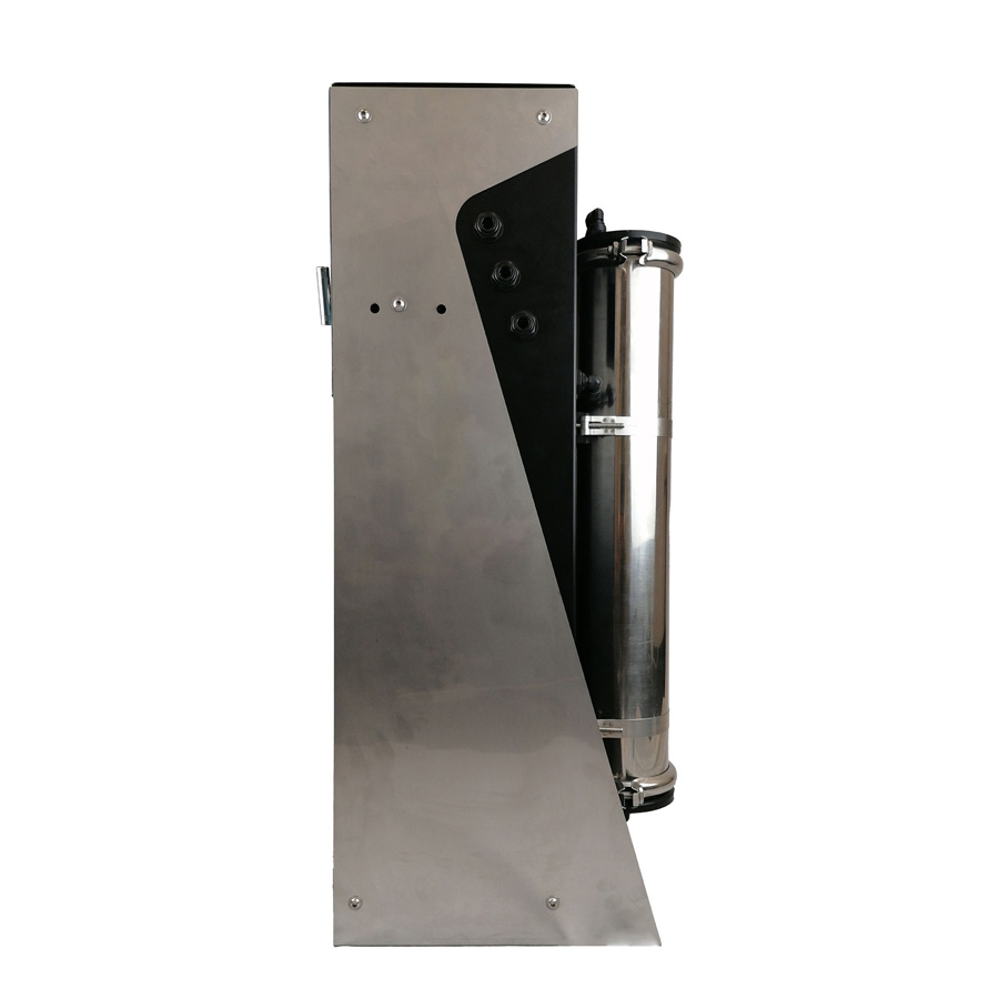 Filterplus® Mini RO sistema yra visiškai komercinis filtravimo įrenginys, skirtas pastatyti ant grindų arba montuoti ant sienos. Jis gali nuolat gaminti didelius kiekius gryno vandens, iki 1200 GPD (3,8 L/min / 228 L/val.). Ši RO sistema turi atliekų reguliavimo vožtuvą, kuris leidžia operatoriui pagal poreikį reguliuoti gryno vandens santykį. Papildomas DI filtro indas gali būti lengvai pridėtas prie įrenginio, kad prireikus būtų užtikrintas tolesnis filtravimas. RO sistema yra visiškai automatinė, leidžianti praplauti ir prižiūrėti įrenginį bei užtikrinanti itin efektyvią atvirkštinio osmoso vandens sistemą. Be to, kaip papildoma galimybė yra sieninis laikiklis, kad prireikus būtų atlaisvinta grindų erdvė, taip pat RO įrenginys turi nerūdijančio plieno atraminį rėmą, kad drėgnoje aplinkoje būtų sumažinta rūdžių.