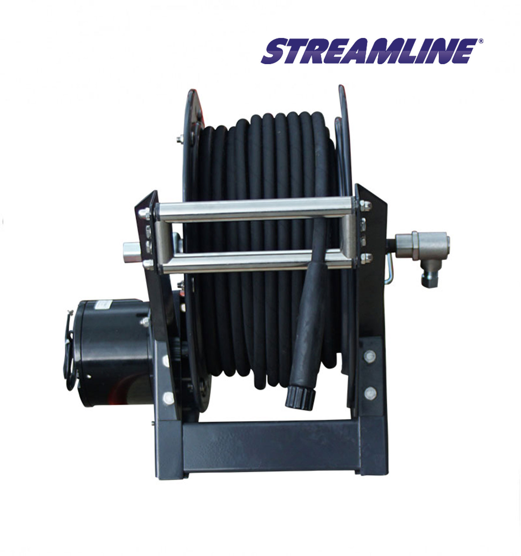 Metalinis A formos žarnos ritė su 12v elektriniu varikliu, valdymo jungikliu, žarnos kreipikliu ir 50 metrų (150 pėdų) 3/8 colio aukšto slėgio žarna. Tai reiškia, kad jums niekada nereikės vėl vynioti žarnų ričių!