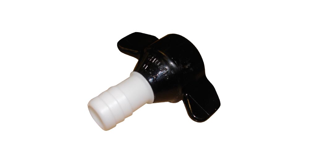 Juoda pasukama veržlė (1/2? NPT) su baltu žarnos antgaliu, skirta 1/2? vidinio skersmens žarnai.