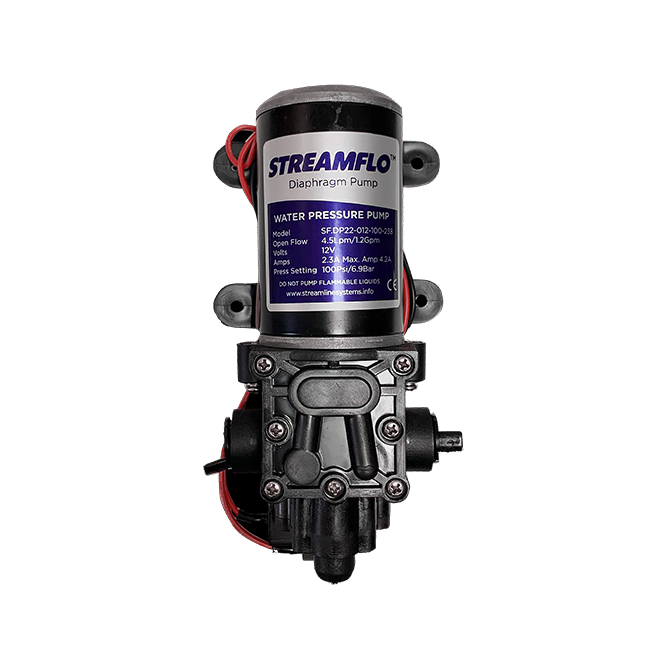 Pramonėje pirmaujantis Streamflo® 12V DC vandens siurblys – 100psi, 4,5lpm atviro srauto greitis. Labai patikimas – tinka valdyti vieną bet kokio aukščio stulpą su iki 100 m žarnos.